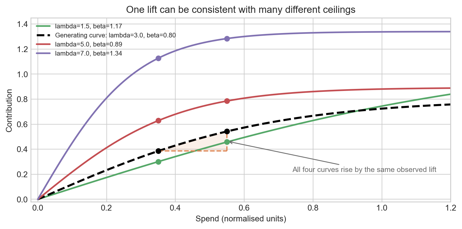 The picture in Figure 3 is also a nice antidote to a common misconception. If the posterior asymptote happens to look reasonable after one lift test, that does not mean the lift by itself identified the ceiling. More often, the lift has carved out a sensible ridge and the rest of the model – observational likelihood, priors, and functional form – has done the rest.