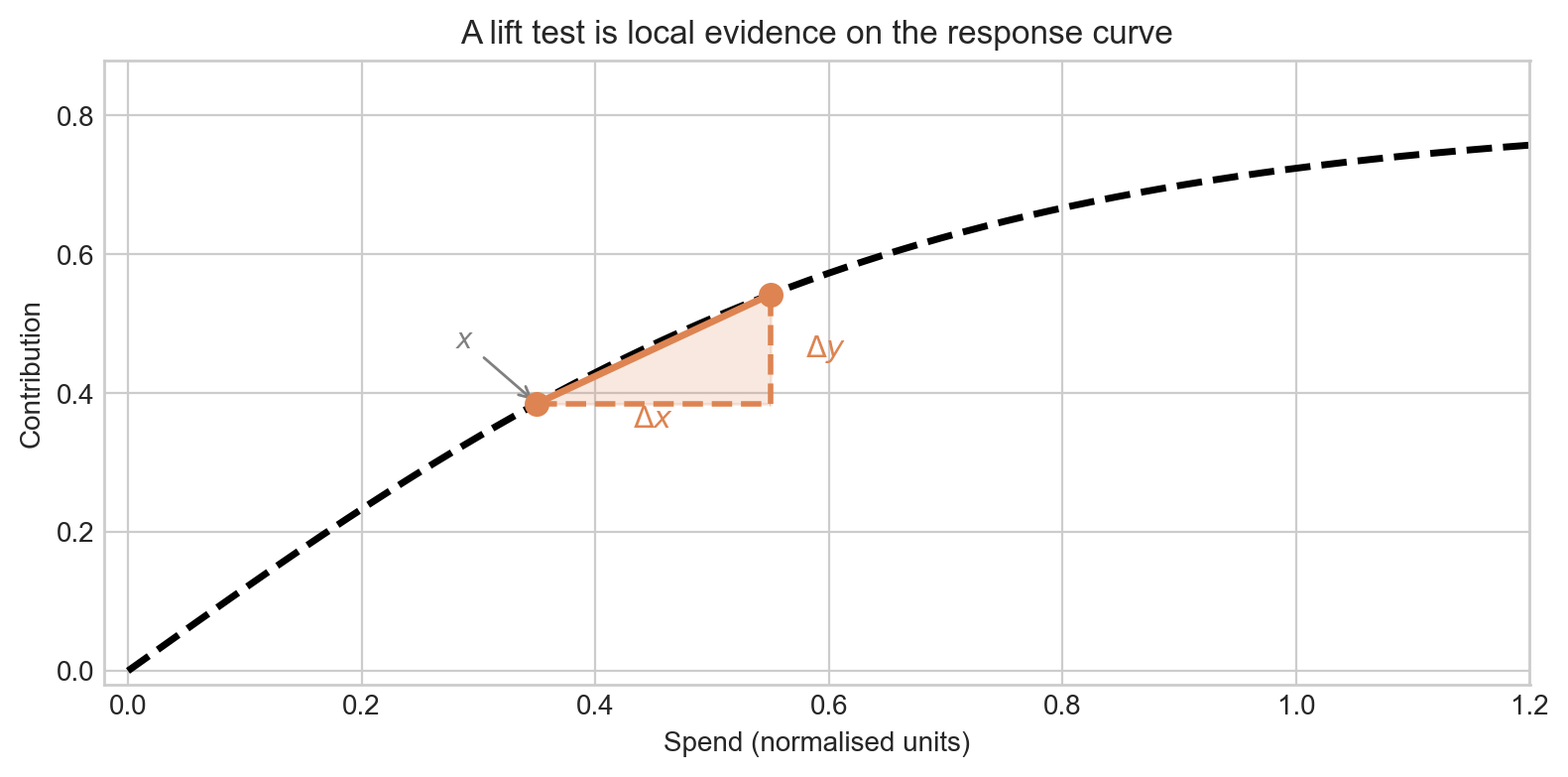 That is easiest to see geometrically: a lift test is a little triangle sitting on the saturation curve. The base is \(\Delta x\), the height is \(\Delta y\), and the operating point is the baseline spend \(x\).