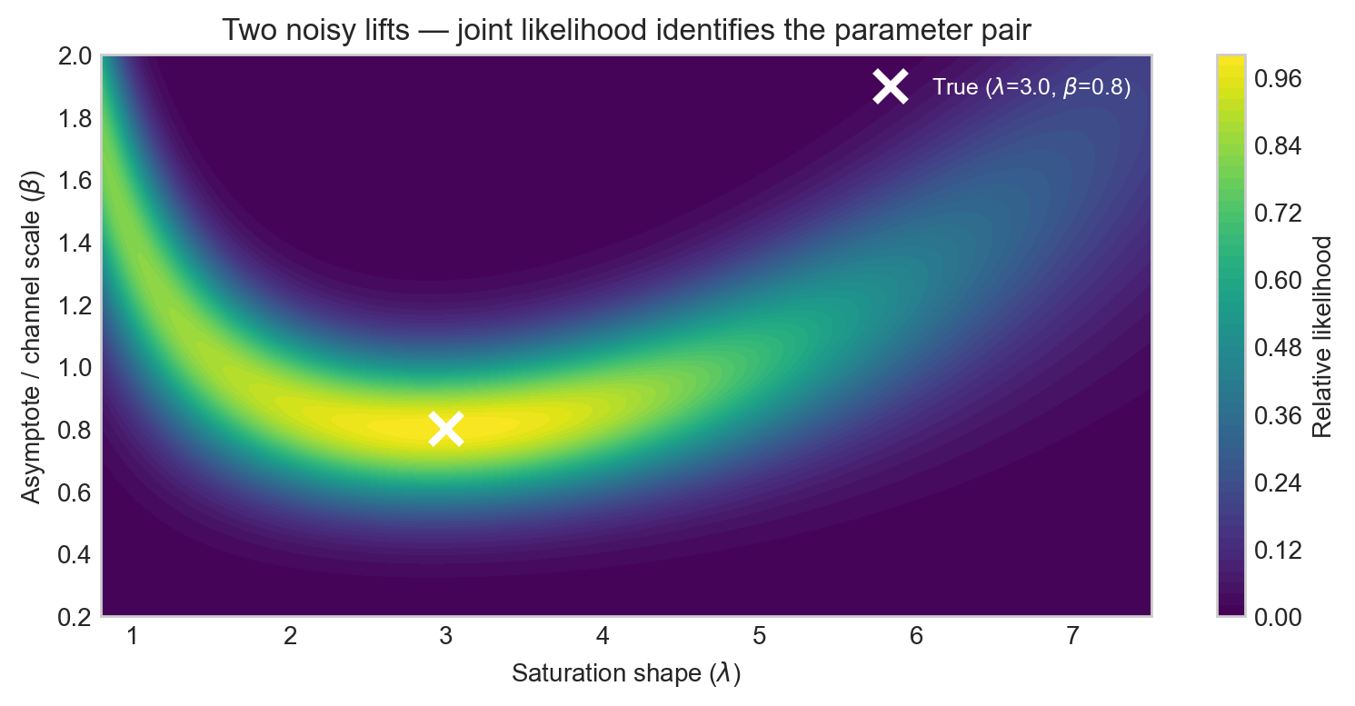 Each likelihood ridge runs roughly along the direction in \((\lambda, \beta)\) space that preserves the incremental ROAS at the tested spend level. That direction is what the experiment cannot distinguish on its own. A second experiment at a different spend level has a ridge running in a different direction, and their intersection is where the real information lies.