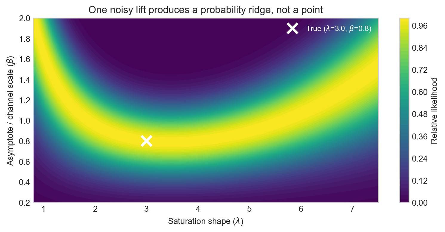 One lift test gives you a constraint curve in \((\lambda, \beta)\) space — not a point estimate for either parameter. With realistic measurement noise, that knife-edge curve broadens into a probability ridge, as we formalise below. That is why a single clean experiment can still leave substantial uncertainty about both the shape and the ceiling, even when it is highly informative about the local response near the tested spend level.