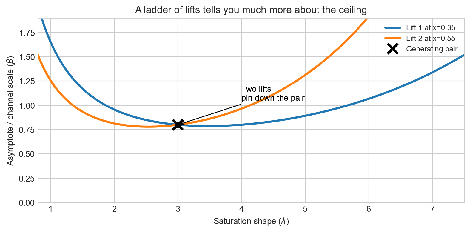 Figure 2 is the key intuition. A shallow curve with a larger ceiling can fit the same local rise as a steeper curve with a smaller ceiling. A single lift test rules out a lot of nonsense, but it does not usually collapse the problem to one unique ceiling.